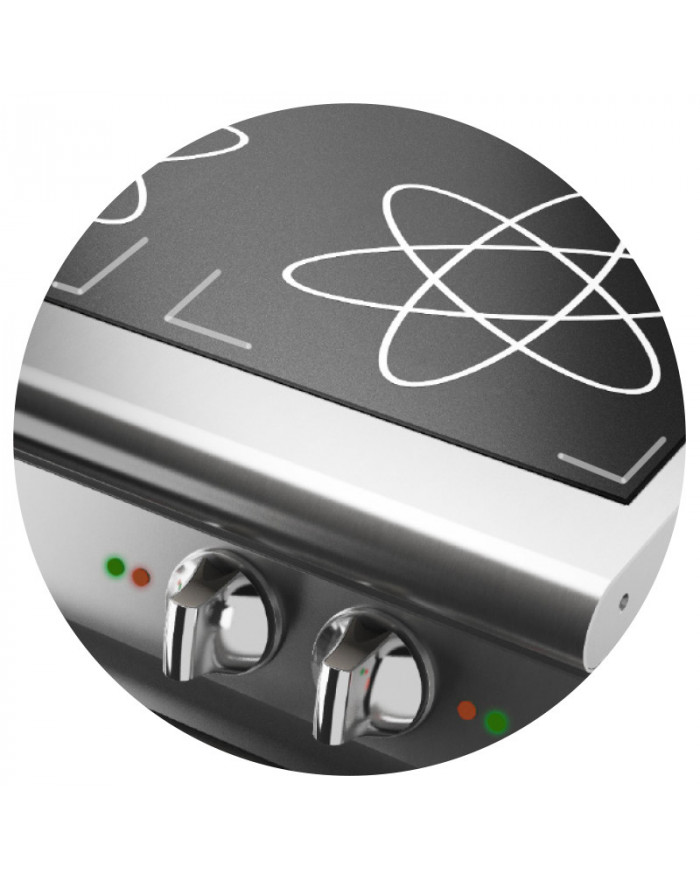 A főzőterek azonosítására szolgáló szerigráfiák. Biztonsági érzékelő megakadályozza a túlmelegedést. 12 fokozatban állítható teljesítmény