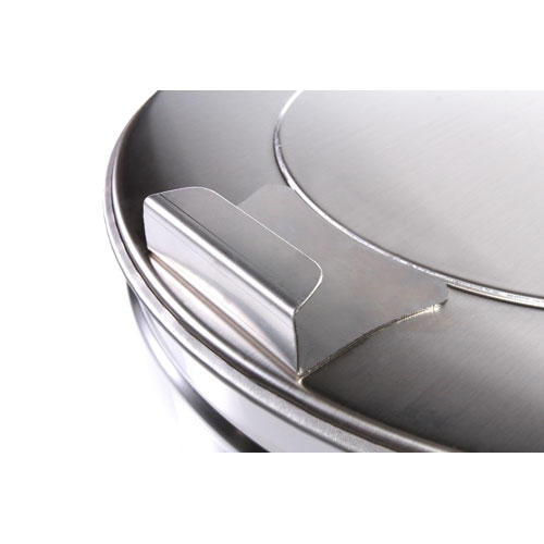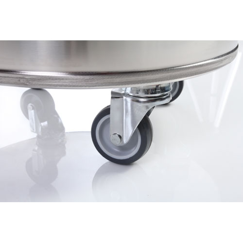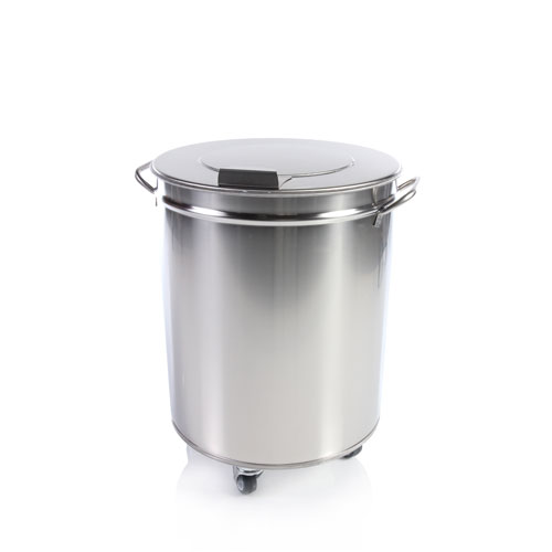 Önbeálló kerekek, vízmentesen záró fenékhegesztés, moslékoló nyílás alá gördíthető, a fedél a szemetes fülére akasztható, anyaga: rozsdamentes acél, származási hely: Olaszország.
