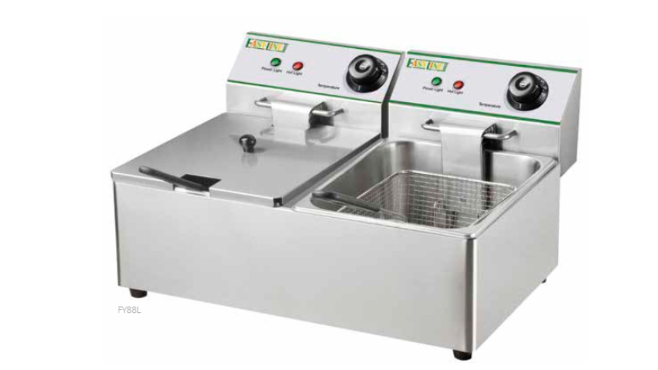A FIMAR Easyline FY88L egy nagy kapacitású, rozsdamentes acél dupla olajsütő, amelyet kifejezetten éttermek, büfék és nagy forgalmú vendéglátóhelyek számára terveztek. Két különálló 8 literes tartályával lehetővé teszi, hogy egyszerre nagy mennyiségű ételt süssünk – külön szabályozható hőmérséklettel, gyorsan és hatékonyan.