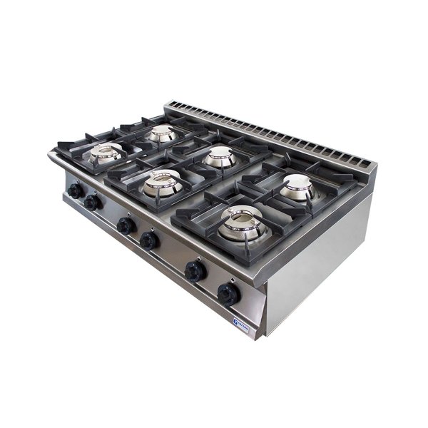 6 égőfejes asztali gáztűzhely, 900-as sorba illeszthető. Nagy hatékonyságú professzionális olasz gyártmányú égőfejek. Az égőfejek őrlánggal és termoelemmel vannak ellátva. A tűzhelyrácsok öntöttvasból készülnek, az edények stabil elhelyezésének érdekében.