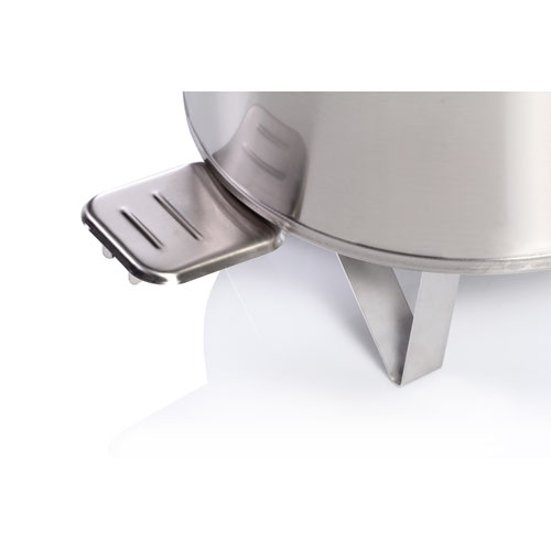 Lábpedállal nyitható fedél, 2 db önbeálló kerékkel és támasztó lábbal, vízmentesen záró fenékhegesztés, moslékoló nyílás alá gördíthető, a levehető fedél a szemetes fülére akasztható, anyaga: rozsdamentes acél, származási hely: Olaszország.
