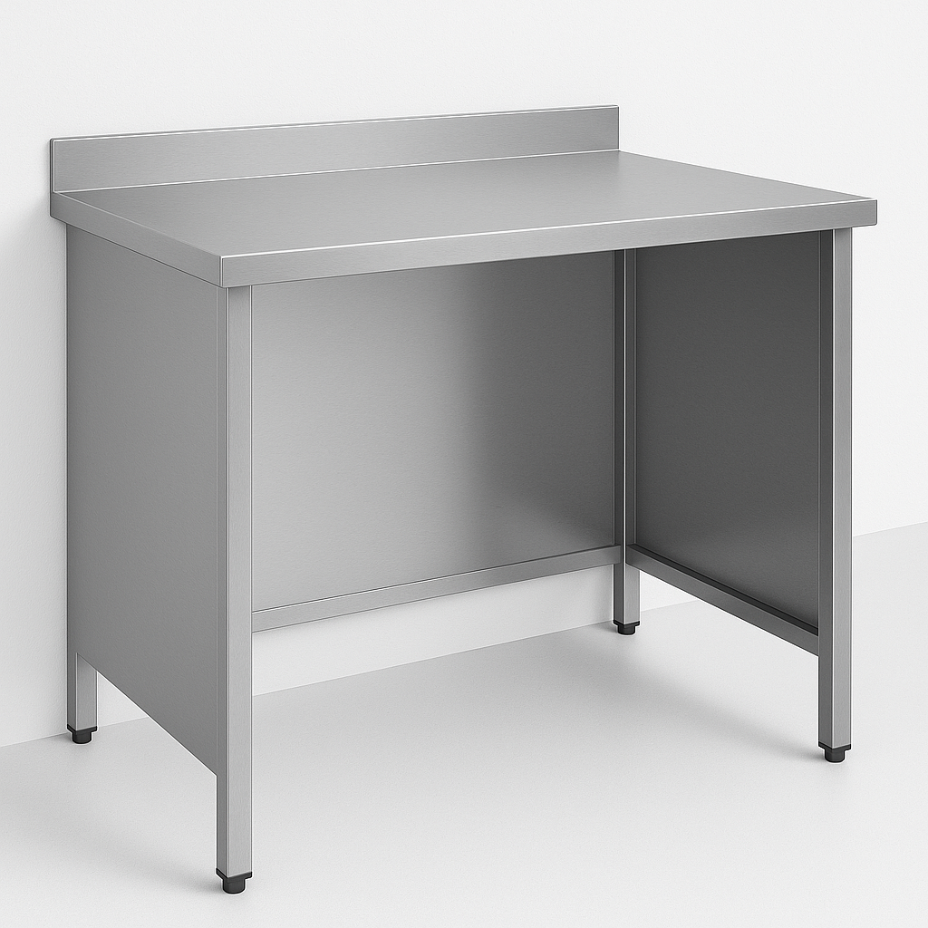 Anyaga 1.4301 rozsdamentes acél. Lemezvastagság: 1,2 mm. Asztallap vastagsága: 50 mm. Az asztallap rezgésmentes, rozsdamentes merevítőbordákkal erősített. Asztallap hátsó felhajtása: 50 mm. Lábak: négyzetes profil 40x40x1,2 mm, állítható műanyag szintező talpakkal.