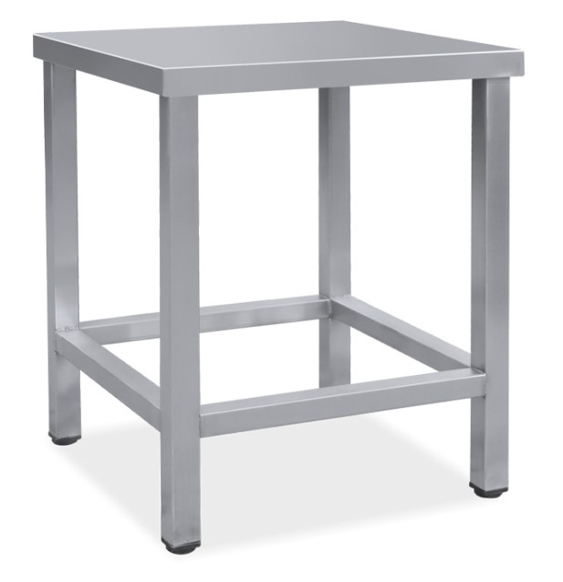 Anyaga DIN 1.4301 rozsdamentes acél. Lemezvastagság: 1,2 mm. Asztallap vastagsága: 50 mm. Az asztallap rezgésmentes, rozsdamentes merevítőbordákkal erősített. Asztallap hátsó felhajtása: 50 mm. Alsó polclap vastagsága: 50 mm. Az alsó polcok felső síkja a padozattól 200 mm. Lábak: négyzetes profil 40x40x1,2 mm, állítható műanyag szintező talpakkal.