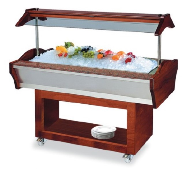 Hűtött salátabár jégdara tárolására, melyen halat és gyümölcsöt lehet hűteni és esztétikusan bemutatni. Továbbá világitással, dekoratív faborítással és rozsdamentes acél elemekkel, alul pedig polccal rendelkezik.