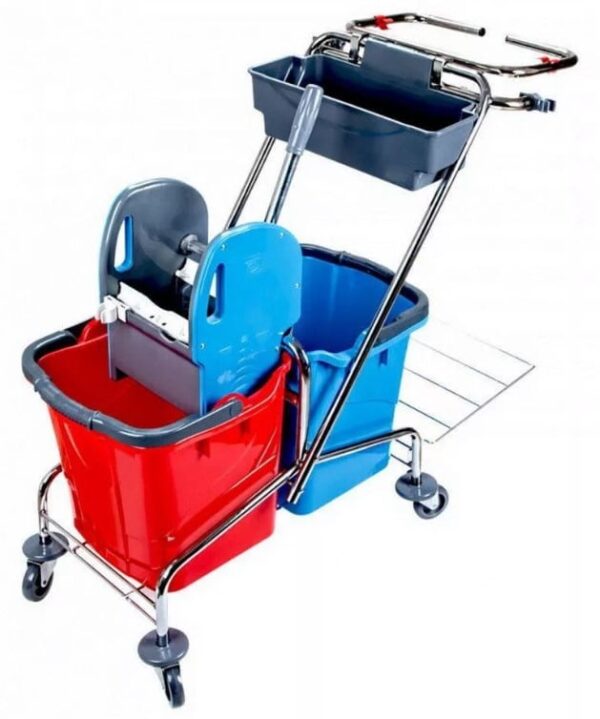 Takarítókocsi, krómvázas, zsáktartóval, 2×25 literes vödörrel