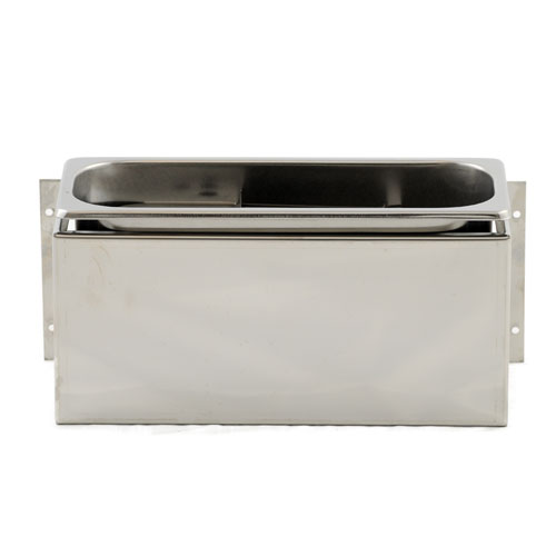 Tartályos kanáltartó túlfolyócsővel, mélyhúzással gyártott, anyaga: rozsdamentes acél, tartókonzol nélkül, származási hely: Olaszország.