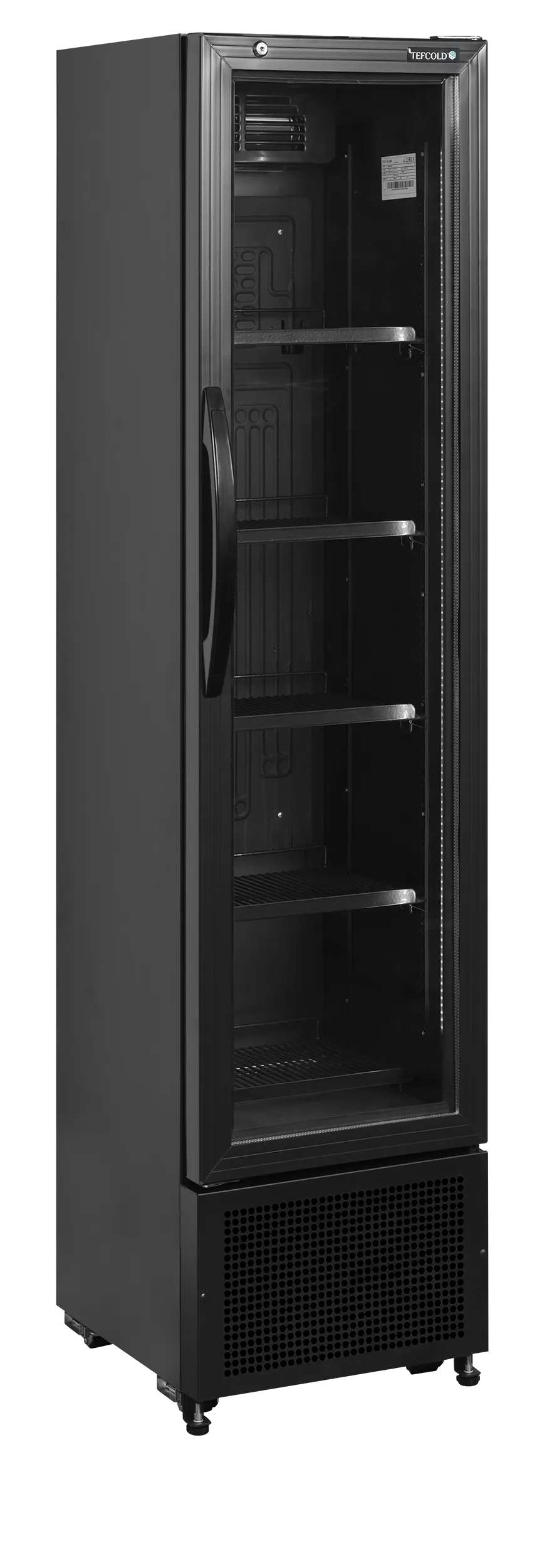 A TEFCOLD FS176H BLACK egy keskeny, prémium megjelenésű üvegajtós italhűtő, amely mindössze 435 mm széles, így tökéletes választás szűk helyekre, ahol a stílus és az értékesítés maximalizálása egyaránt fontos. A teljesen fekete külső és belső kialakítás modern, elegáns megjelenést biztosít, miközben kiemeli a benne elhelyezett italokat.