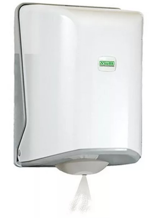 Vialli tekercses kéztörlő adagoló pont adagolással. A papírt egy szűkített nyíláson keresztül lehet kihúzni az adagolóból, ezáltal a perforáció mentén elszakad, így egyszerre csak egy lap kerül a felhasználó kezébe. 19 cm átmérőjű, perforált, belső mag adagolású tekercses kéztörlő papírral használható.